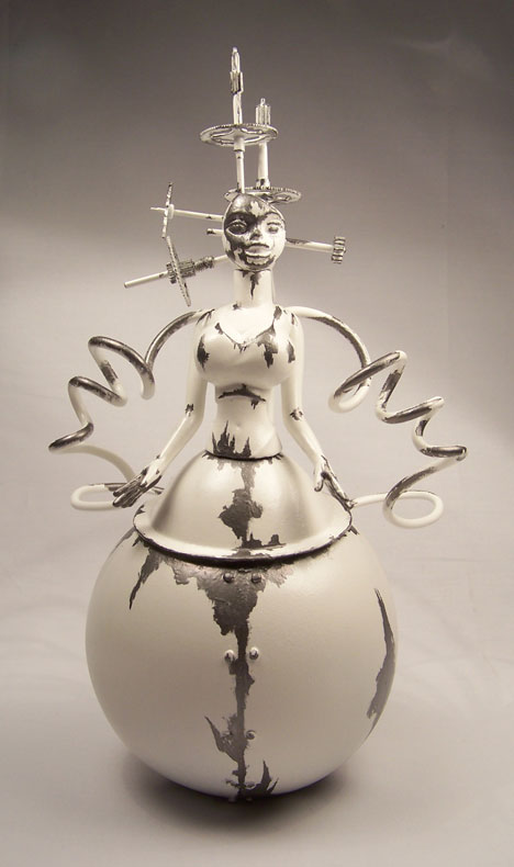 These 3 pieces are entitled The Weaver (top) Akuma (above), and The Speedball (below), three sculptures made of recycled objects...